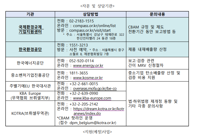우리 정부와 유관기관은 우리 기업들의 CBAM 대응을 지원하기 위해 자문 및 상담기관을 운영하고 있으며 지원사업도 추진(예정)하고 있다고 합니다.