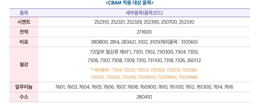 대상품목(철강, 알루미늄, 시멘트, 비료, 전력, 수소 6대 품목과 볼트, 너트 등 관련 소비재 등)을 EU로 수출하는 모든 역외국가는 내재된 배출량 1톤당 CBAM 인증 1개를