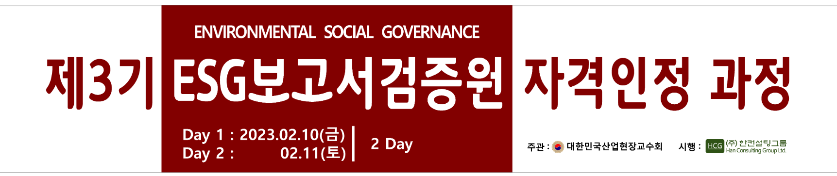 3기 'ESG 보고서 검증원 '자격인정 과정이 2월 10일 ~11일 진행됩니다.