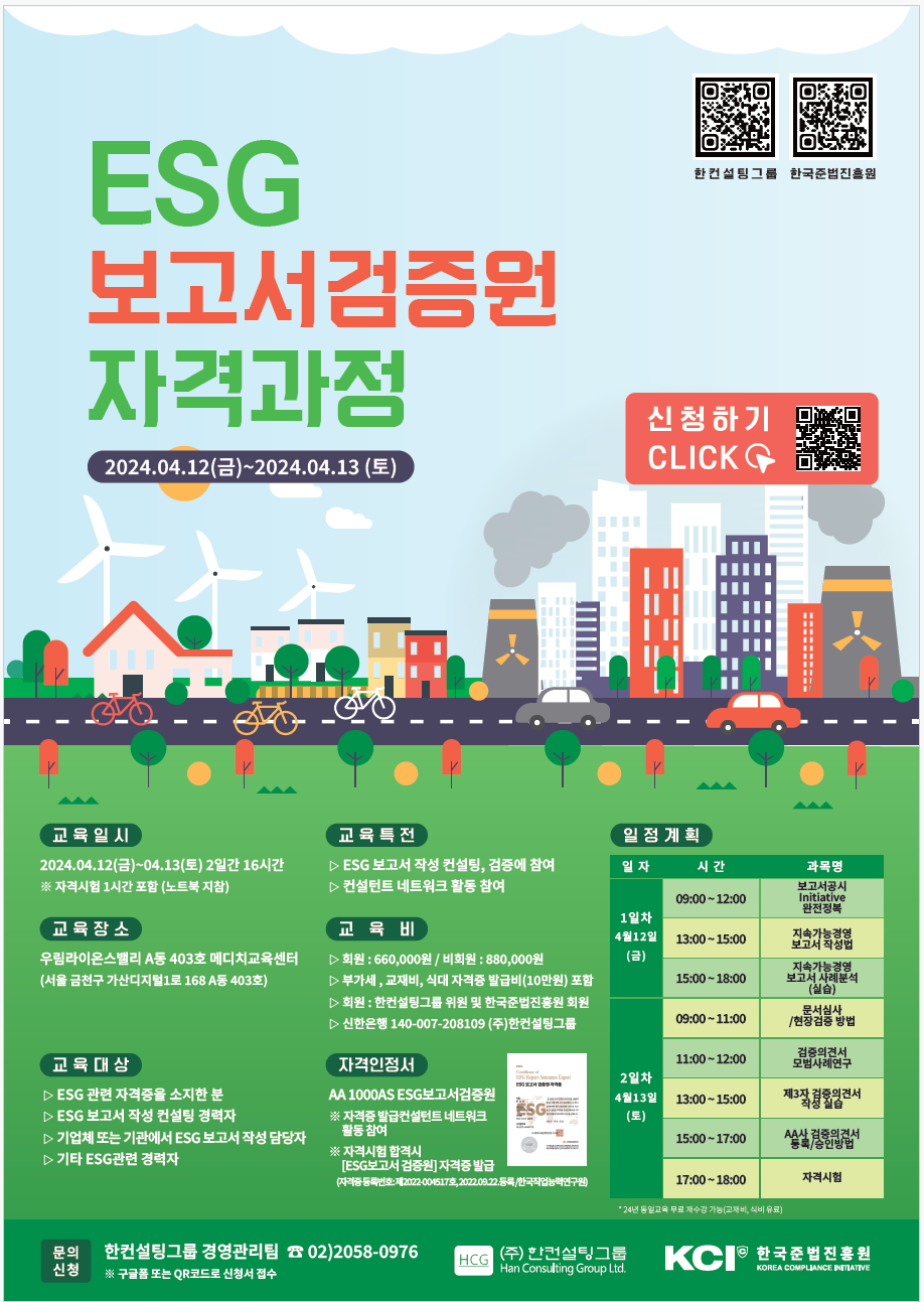 이에 ㈜한컨설팅그룹(www.hcg.kr)과 준법진흥원 (www.grc.or.kr) 공동 진행으로 ESG 보고서검증원 자격과정을 개설합니다.