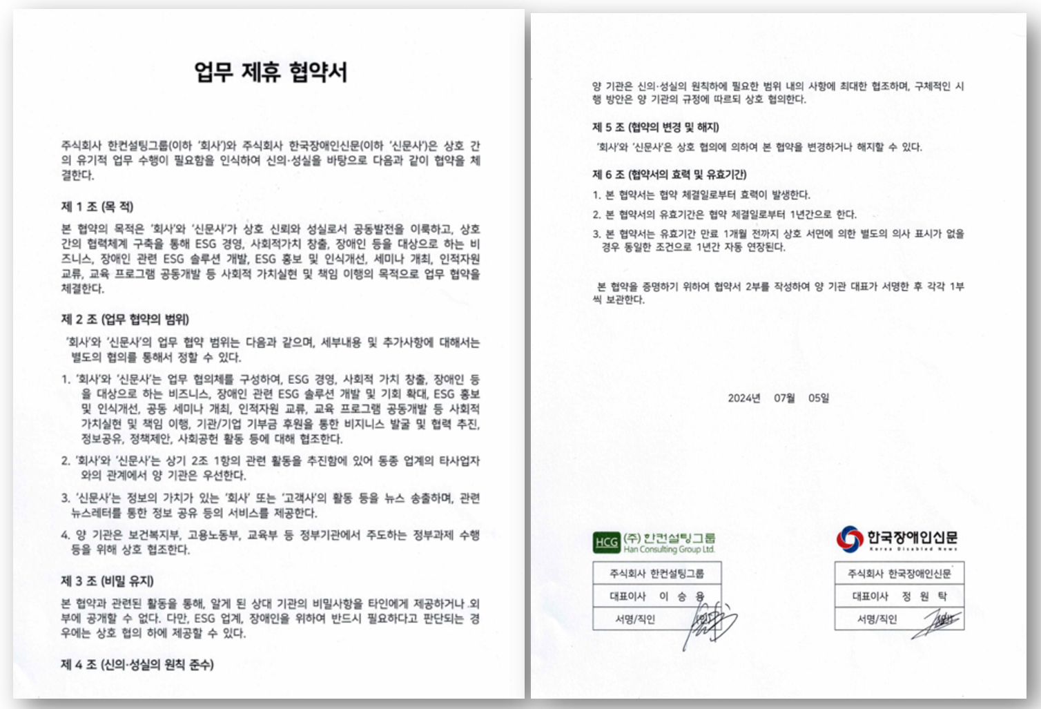 지난 7월5일 가산동 한컨설팅그룹에서 진행된 MOU 체결식에는 이승용 한컨설팅그룹 대표이사와 정원탁 한국장애인신문 대표이사를 비롯해 양사 임직원과 관계자들이 참석했습니다.